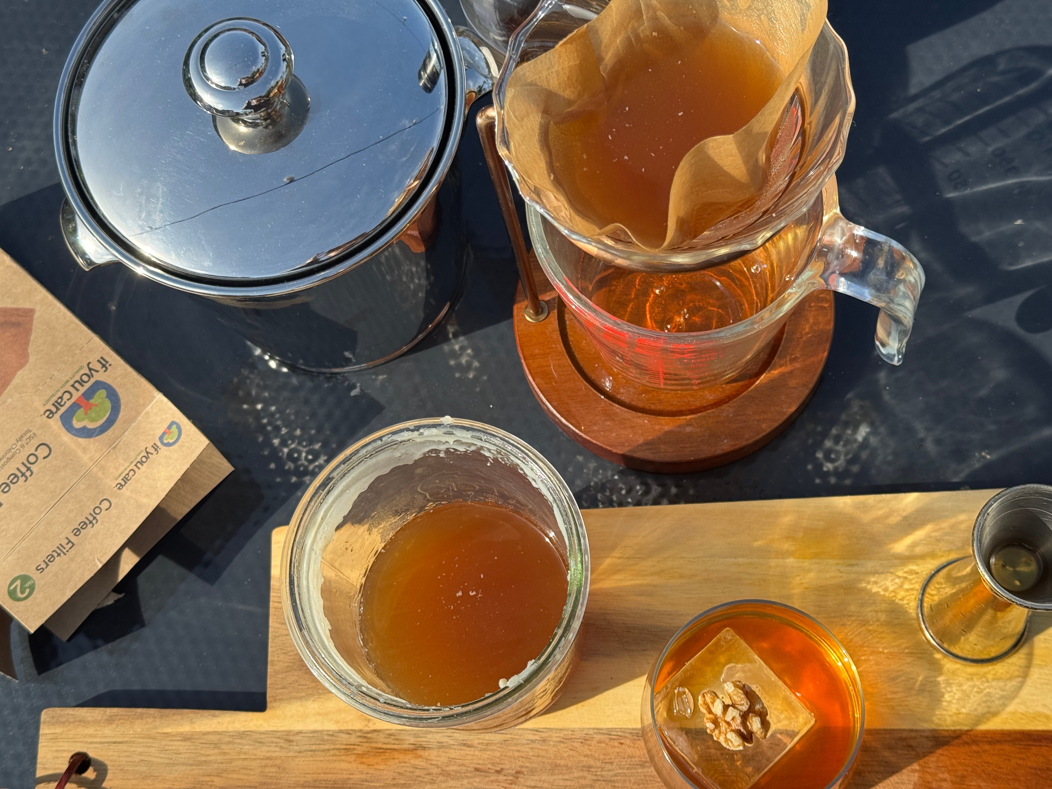 Skim and strain. Remove the solid fat layer and strain the bourbon through a coffee filter or fine mesh sieve lined with cheesecloth.