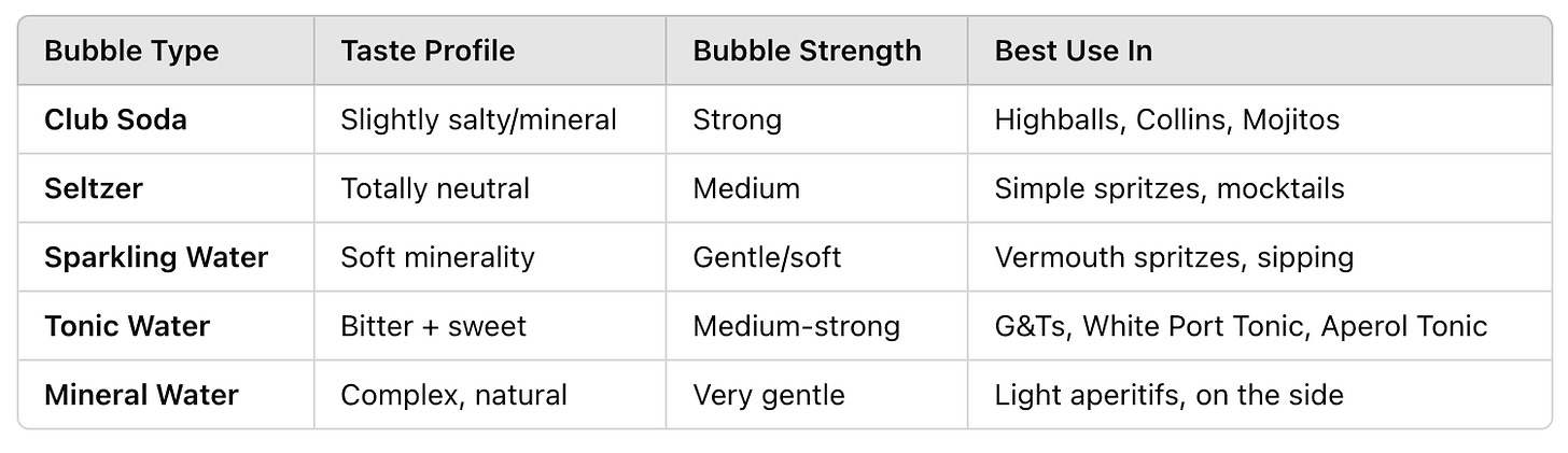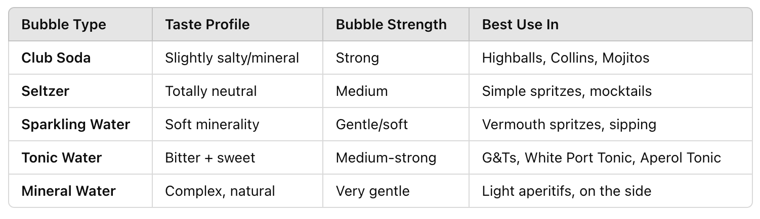 Tight, firm bubbles that last longer than seltzer or sparkling water. Great for keeping a cocktail lifted and crisp.