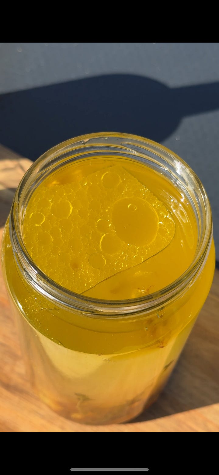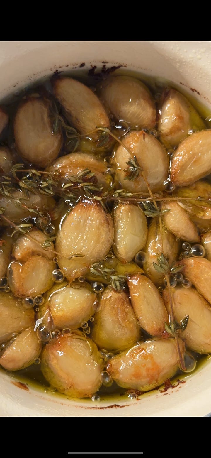 Step 2: Add to a mini cast-iron and fill with olive oil until the garlic is fully submerged. (option to add fresh thyme to the mix)