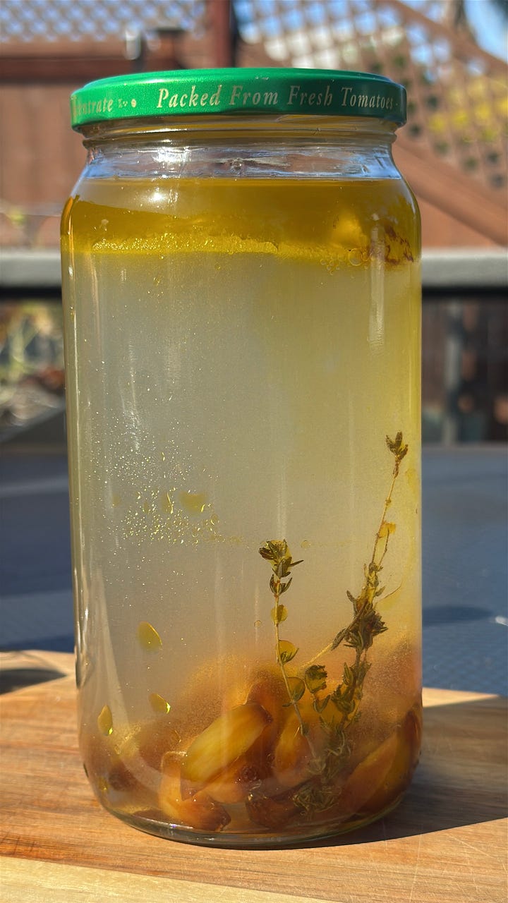 Step 4: Let cool completely before using the garlic and oil to fat-wash our gin.